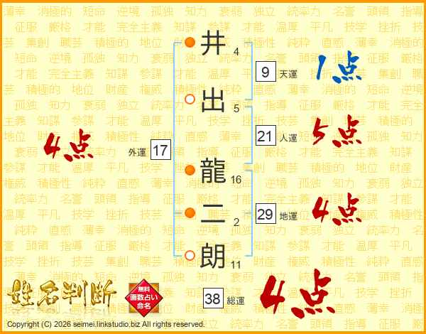 井(4画)出(5画) 龍(16画)二(2画)朗(11画)