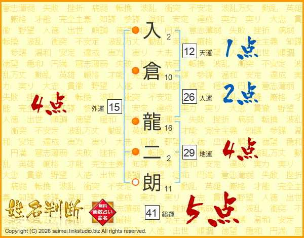 入倉龍二朗さんの総運は41画の5点!