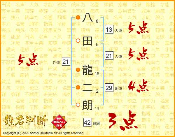 八田龍二朗さんの人運は21画の5点!