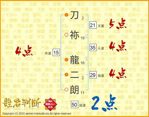 刀(2画)祢(19画) 龍(16画)二(2画)朗(11画)