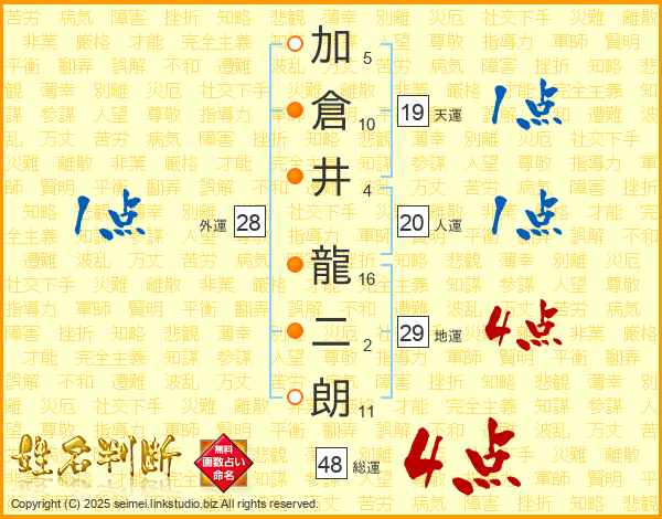 加(5画)倉(10画)井(4画) 龍(16画)二(2画)朗(11画)