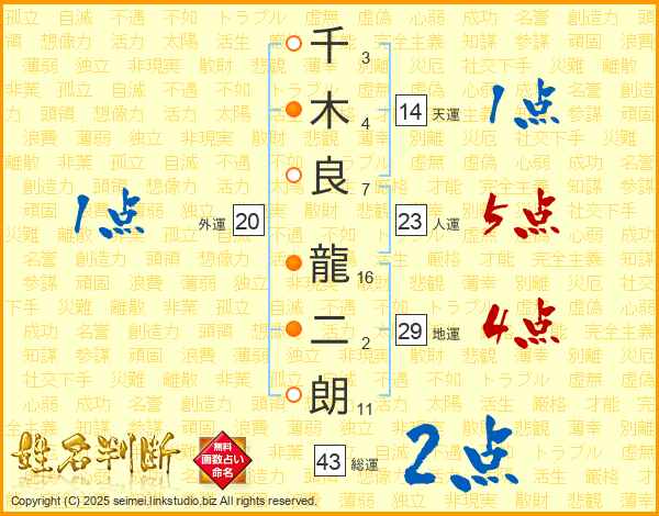 千(3画)木(4画)良(7画) 龍(16画)二(2画)朗(11画)
