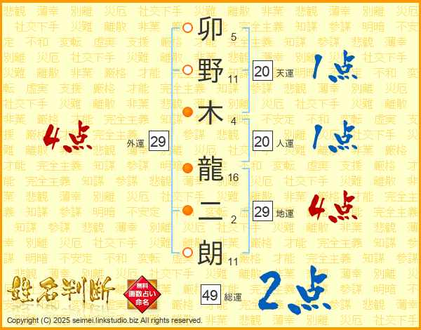 卯(5画)野(11画)木(4画) 龍(16画)二(2画)朗(11画)