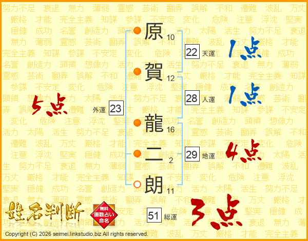 原(10画)賀(12画) 龍(16画)二(2画)朗(11画)