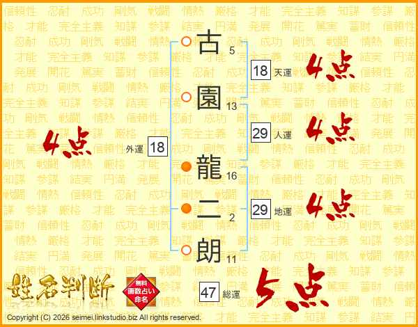 古(5画)園(13画) 龍(16画)二(2画)朗(11画)