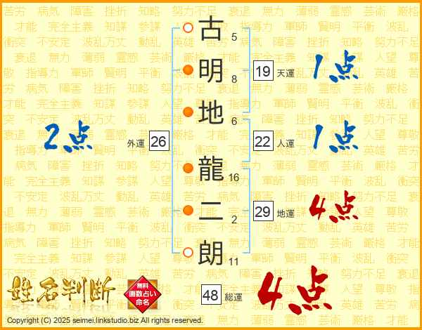 古(5画)明(8画)地(6画) 龍(16画)二(2画)朗(11画)