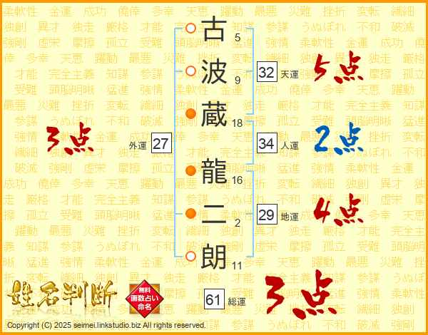 古(5画)波(9画)蔵(18画) 龍(16画)二(2画)朗(11画)