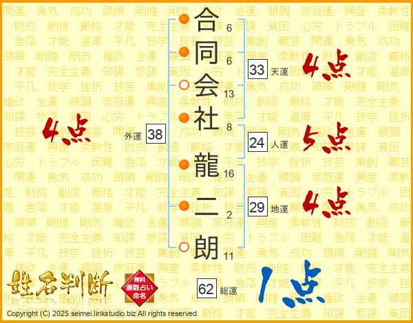 合(6画)同(6画)会(13画)社(8画) 龍(16画)二(2画)朗(11画)