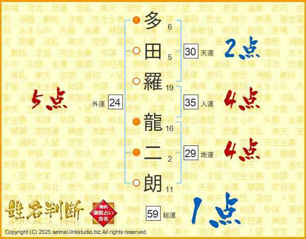 多田羅龍二朗さんの総運は59画の1点!