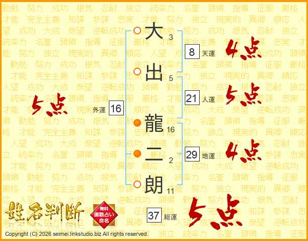 大(3画)出(5画) 龍(16画)二(2画)朗(11画)