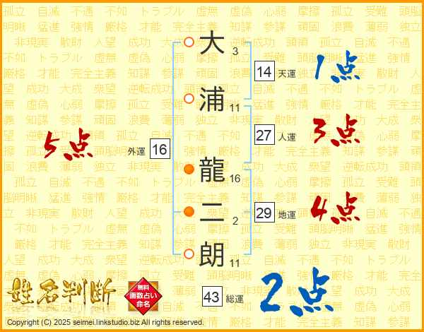 大(3画)浦(11画) 龍(16画)二(2画)朗(11画)