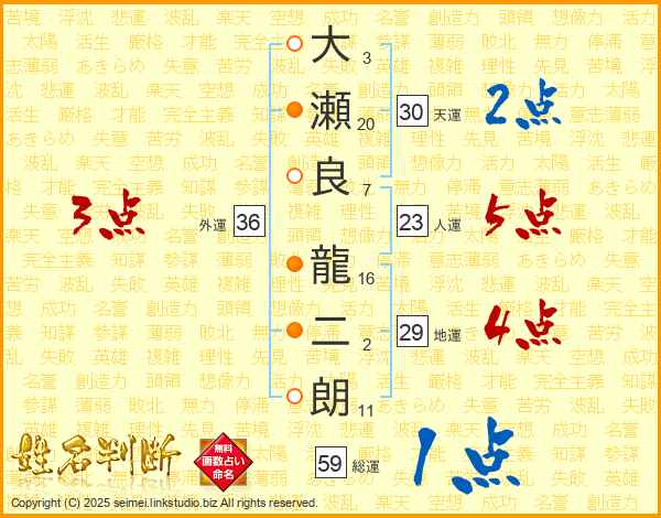 大(3画)瀬(20画)良(7画) 龍(16画)二(2画)朗(11画)