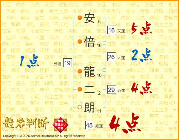 安(6画)倍(10画) 龍(16画)二(2画)朗(11画)