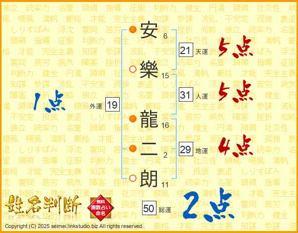 あなたの人生を表す1番重要な運勢です。生涯を通じて影響する総合運となり、主に50歳以降の晩年期に影響を及ぼします。苗字と名前の合計画数。