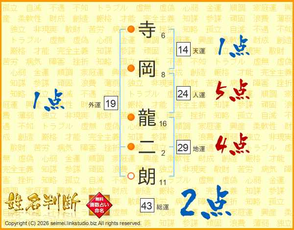 寺岡龍二朗さんの人運は24画の5点!