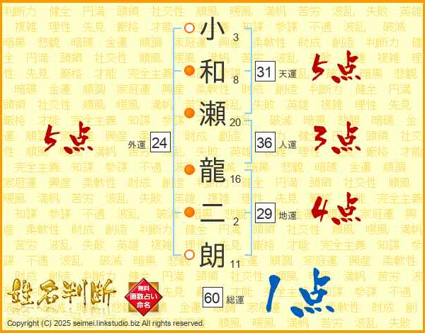 小(3画)和(8画)瀬(20画) 龍(16画)二(2画)朗(11画)