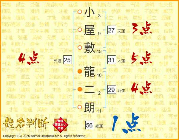 小(3画)屋(9画)敷(15画) 龍(16画)二(2画)朗(11画)
