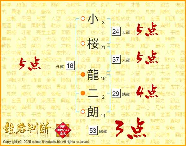 小(3画)桜(21画) 龍(16画)二(2画)朗(11画)