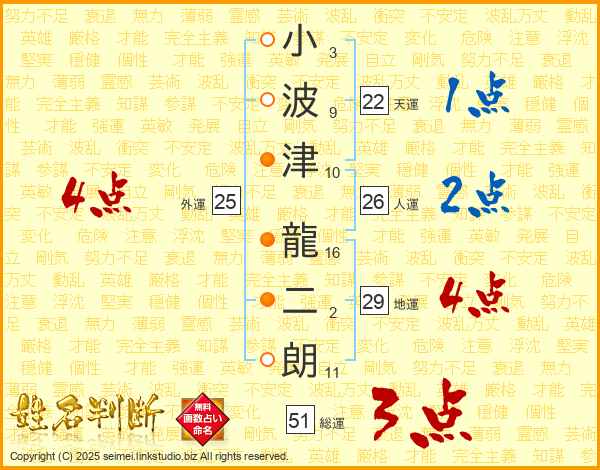 小(3画)波(9画)津(10画) 龍(16画)二(2画)朗(11画)