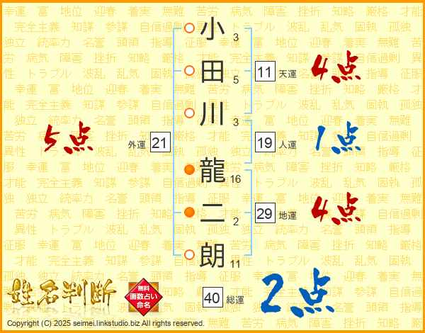 小(3画)田(5画)川(3画) 龍(16画)二(2画)朗(11画)