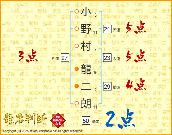 小(3画)野(11画)村(7画) 龍(16画)二(2画)朗(11画)