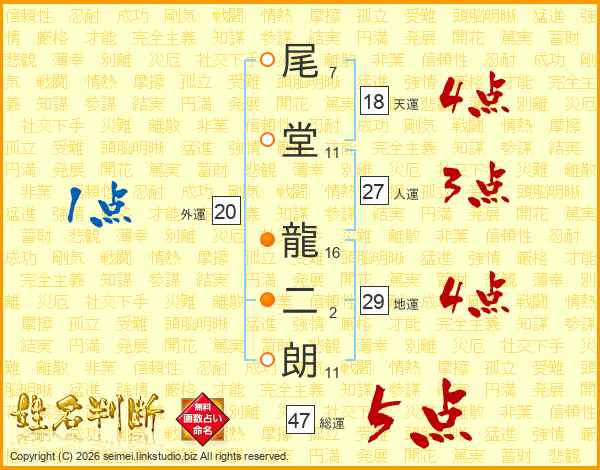 尾堂龍二朗さんの総運は47画の5点!