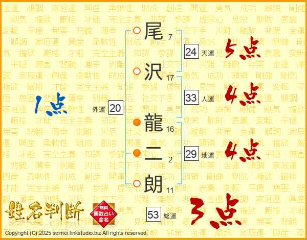 尾(7画)沢(17画) 龍(16画)二(2画)朗(11画)