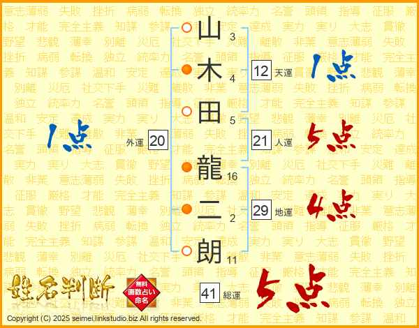 山(3画)木(4画)田(5画) 龍(16画)二(2画)朗(11画)