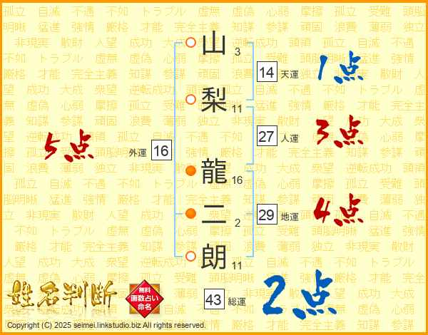 山(3画)梨(11画) 龍(16画)二(2画)朗(11画)