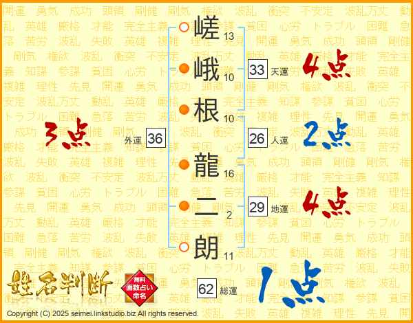 嵯(13画)峨(10画)根(10画) 龍(16画)二(2画)朗(11画)
