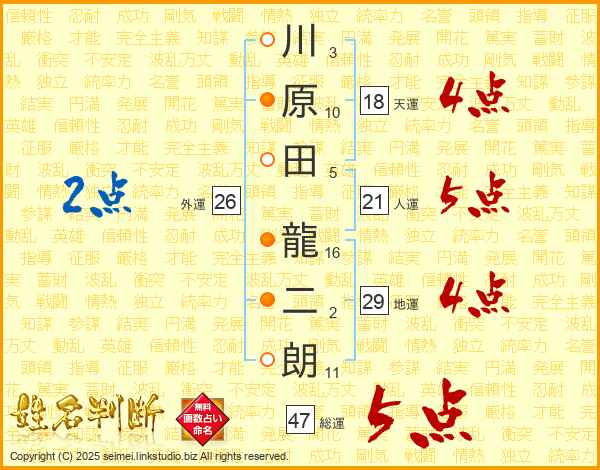 川(3画)原(10画)田(5画) 龍(16画)二(2画)朗(11画)