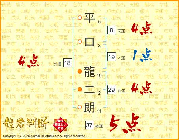 平(5画)口(3画) 龍(16画)二(2画)朗(11画)