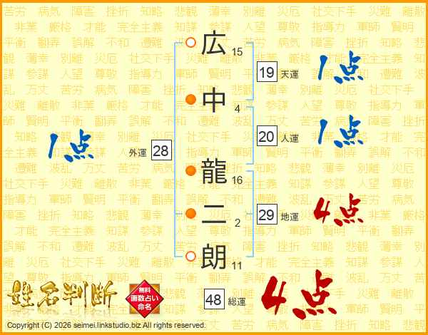 広(15画)中(4画) 龍(16画)二(2画)朗(11画)