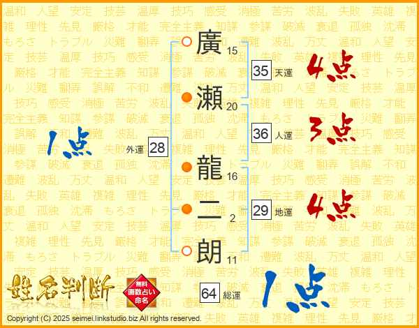 廣(15画)瀬(20画) 龍(16画)二(2画)朗(11画)