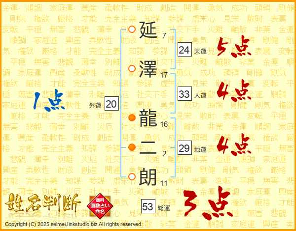 延(7画)澤(17画) 龍(16画)二(2画)朗(11画)