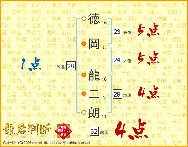 徳(15画)岡(8画) 龍(16画)二(2画)朗(11画)