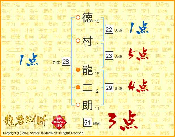 徳(15画)村(7画) 龍(16画)二(2画)朗(11画)