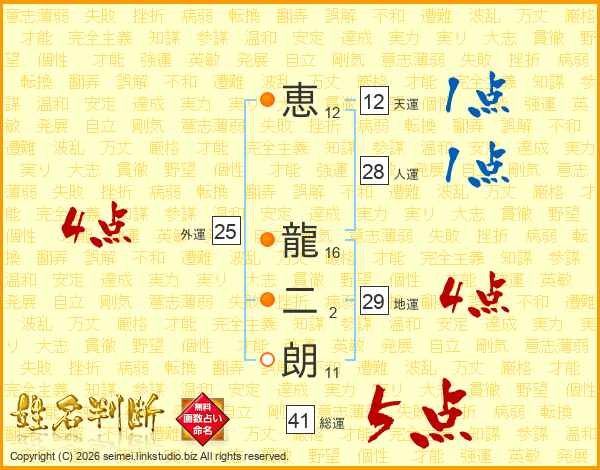 恵(12画) 龍(16画)二(2画)朗(11画)