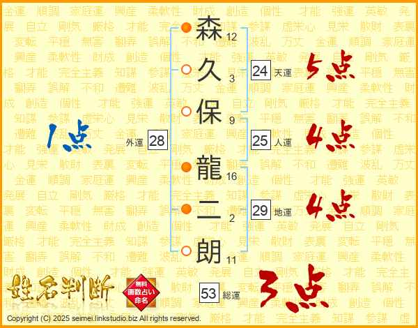 森(12画)久(3画)保(9画) 龍(16画)二(2画)朗(11画)