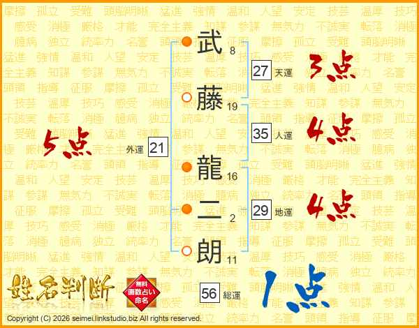 武(8画)藤(19画) 龍(16画)二(2画)朗(11画)