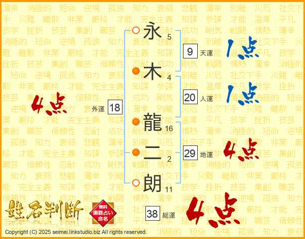永(5画)木(4画) 龍(16画)二(2画)朗(11画)