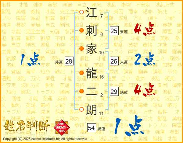 生活面を象徴する運勢です。外部から受ける影響力を表し、結婚運、家庭運や職場、環境への順応性を表します。総運から人運を引いた画数。姓や名が1文字の場合を除く。