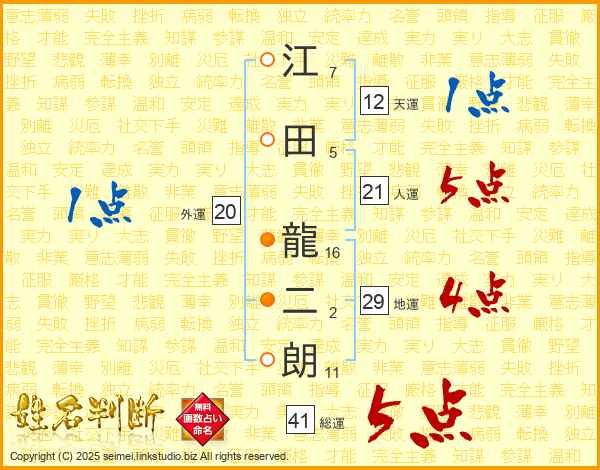 江(7画)田(5画) 龍(16画)二(2画)朗(11画)