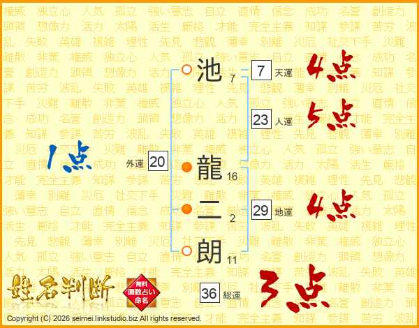 あなたの人生を表す1番重要な運勢です。生涯を通じて影響する総合運となり、主に50歳以降の晩年期に影響を及ぼします。苗字と名前の合計画数。