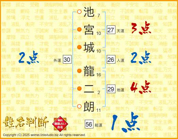 池(7画)宮(10画)城(10画) 龍(16画)二(2画)朗(11画)