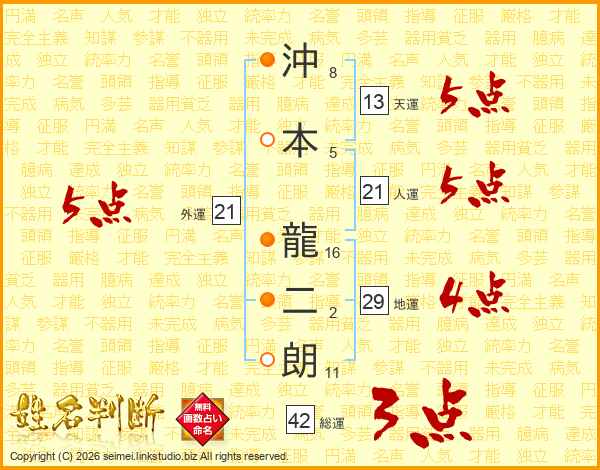沖本龍二朗さんの天運は13画の5点!