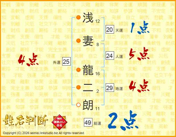 浅(12画)妻(8画) 龍(16画)二(2画)朗(11画)