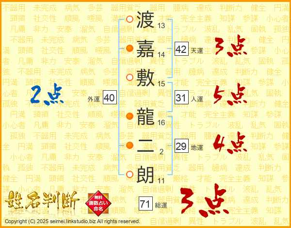 渡嘉敷龍二朗さんの人運は31画の5点!