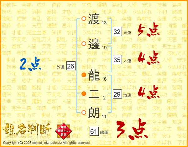 渡(13画)邊(19画) 龍(16画)二(2画)朗(11画)
