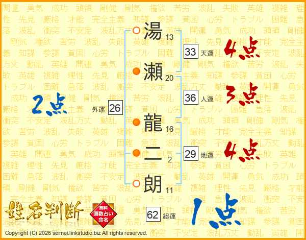湯(13画)瀬(20画) 龍(16画)二(2画)朗(11画)